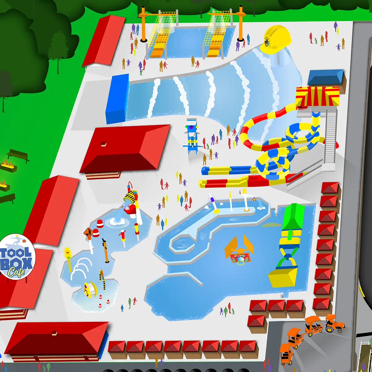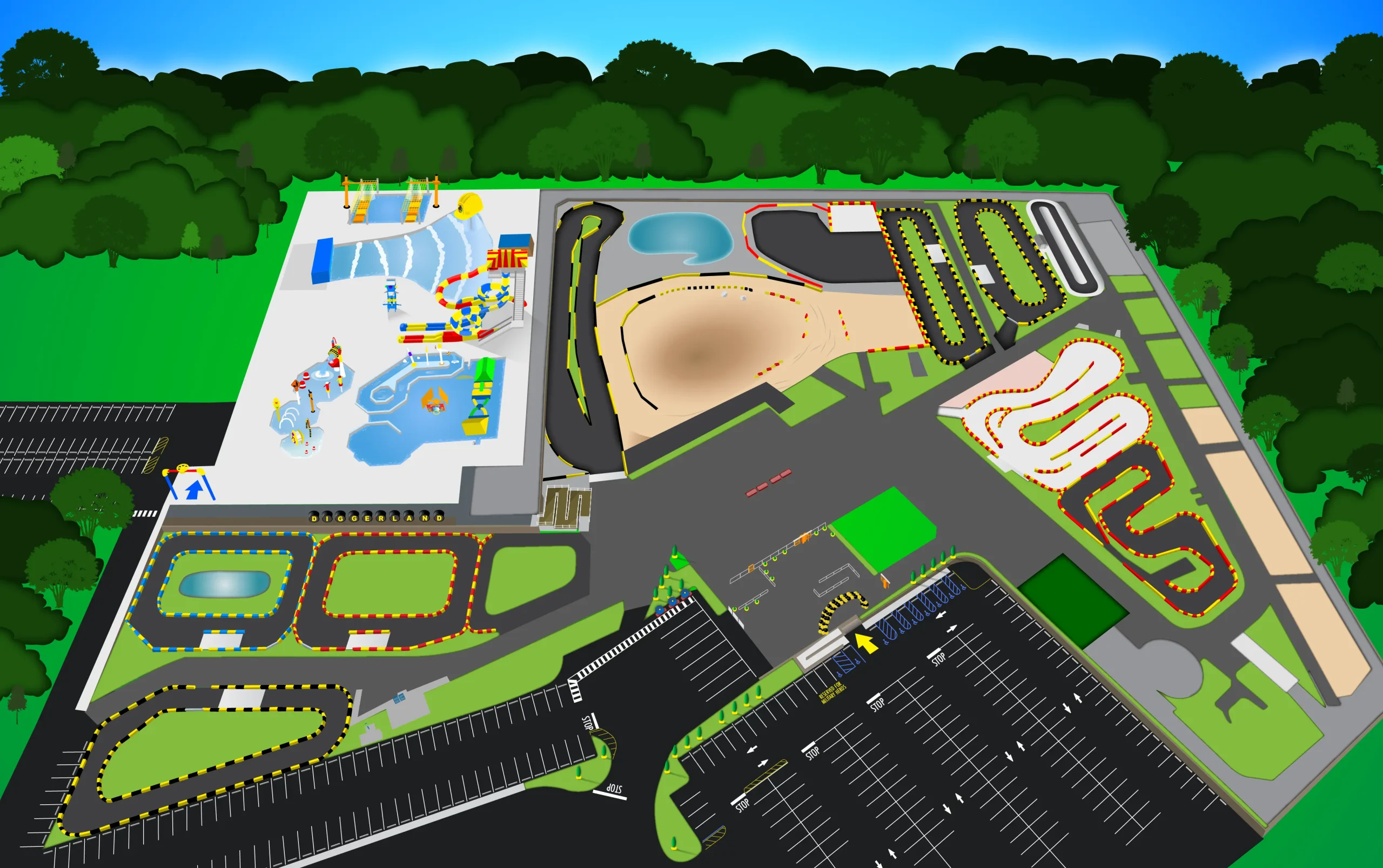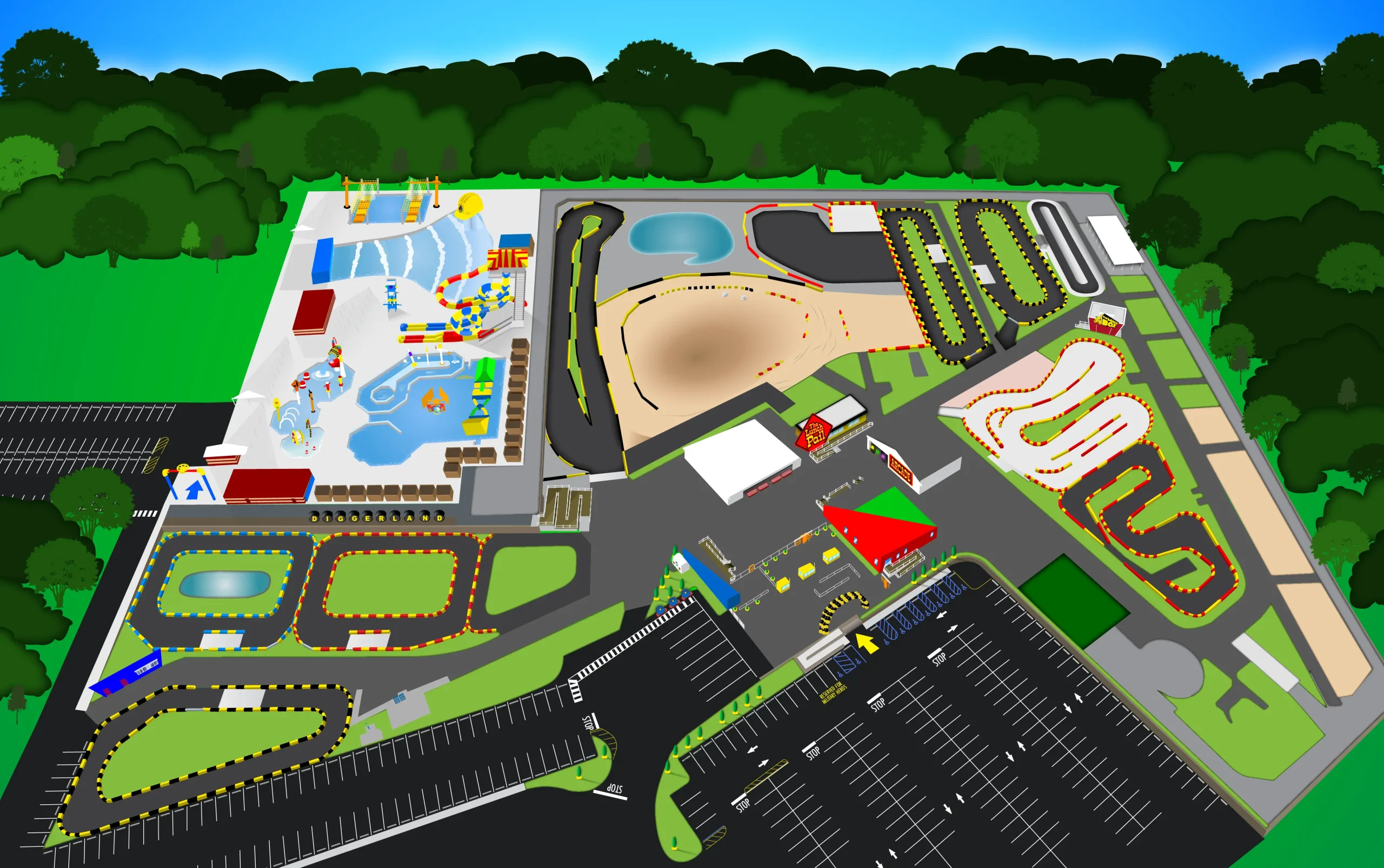 The map was designed with adaptability in mind. As new rides were added, I incorporated 3D plans and updated drone photography to accurately scale and position them. For example, once the wave pool was complete, I overlaid new drone images to finalize the layout. Over time, the map has been revised to reflect continued growth and improvements at the park.