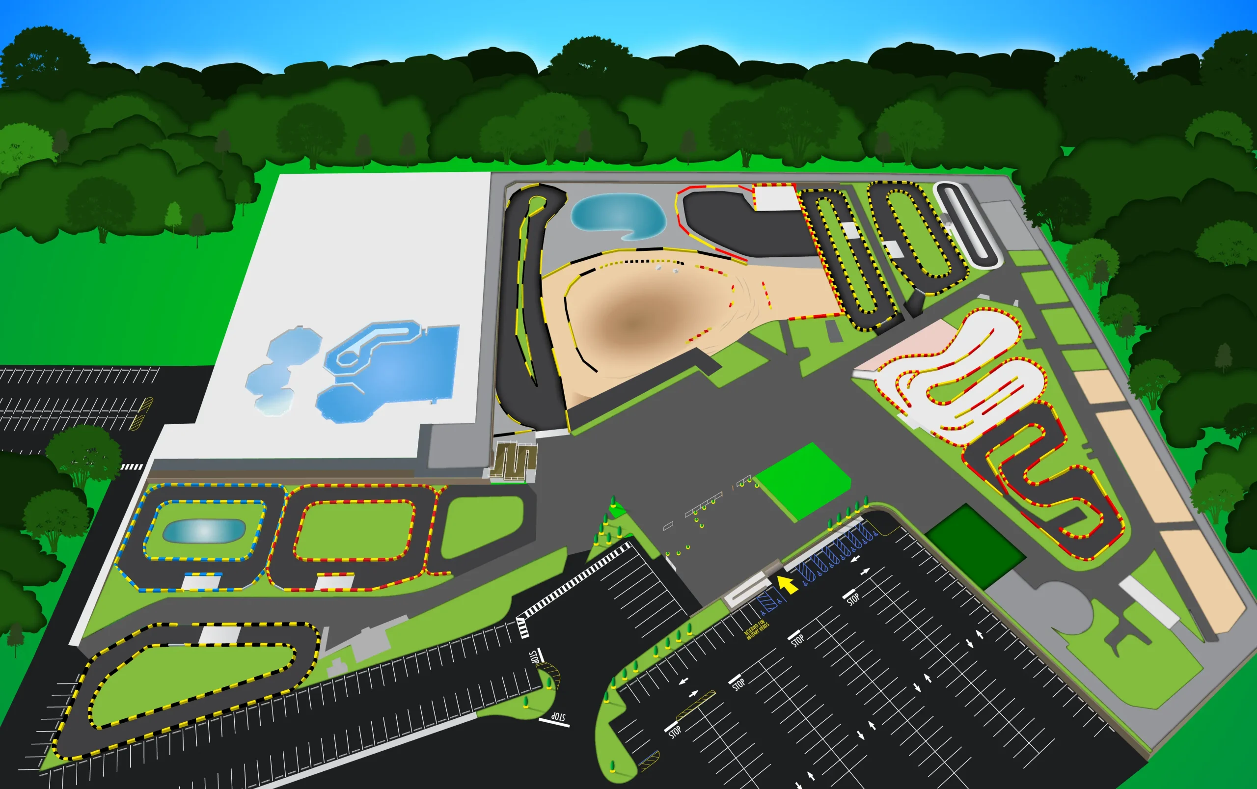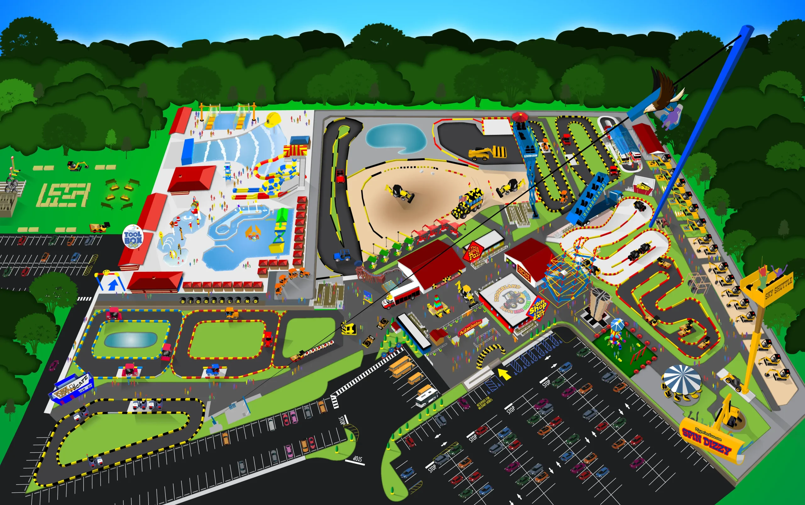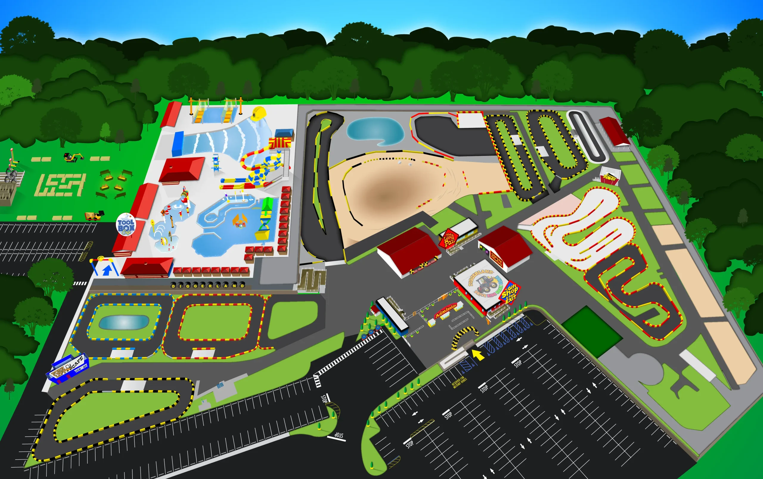 The map was designed with adaptability in mind. As new rides were added, I incorporated 3D plans and updated drone photography to accurately scale and position them. For example, once the wave pool was complete, I overlaid new drone images to finalize the layout. Over time, the map has been revised to reflect continued growth and improvements at the park.